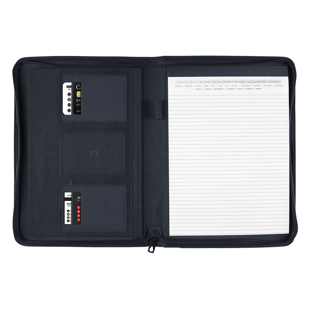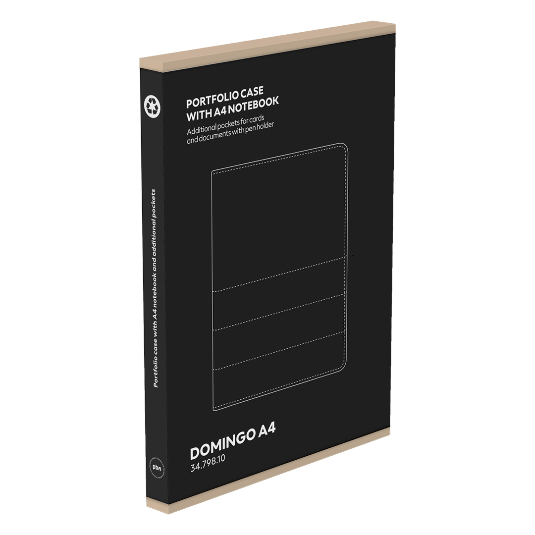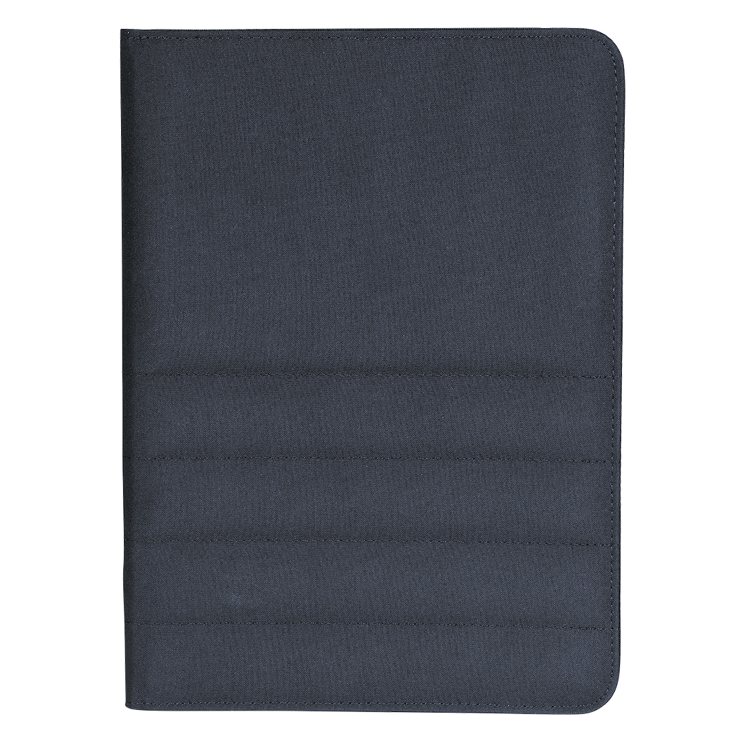 Portfolio sa blokom za beleške formata A4, namenjen poslovnoj i promotivnoj upotrebi. Tekstilna obloga u kombinaciji sa funkcionalnim rasporedom čini ga pogodnim za sastanke, konferencije i prezentacije. Opremljen je dodatnim džepovima za kartice, dokumenta i mobilni telefon, kao i držačem za olovku za praktičnu organizaciju. Korica je izrađena od RPET materijala (reciklirani PET), čime se ističe ekološki karakter proizvoda. Knjižni blok u linije sa 40 strana belog papira gramature 80 g/m² omogućava uredno beleženje.
