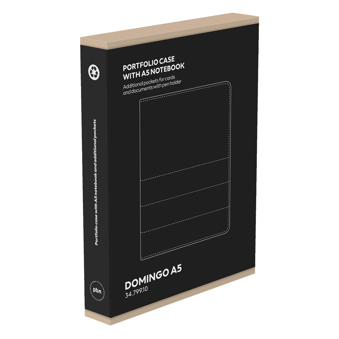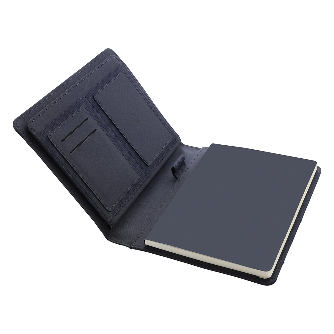 Portfolio sa notesom formata A5, dizajniran za svakodnevnu poslovnu i promotivnu upotrebu. Tekstilna obloga pruža profesionalan i moderan izgled, dok dodatni džepovi za kartice, dokumentaciju i mobilni telefon, zajedno sa držačem za olovku, omogućavaju praktičnu organizaciju. Korica je izrađena od RPET materijala (reciklirani PET), što ga čini pogodnim za ekološki osvešćene kampanje. Notes sadrži knjižni blok u linije sa 128 strana krem papira gramature 80 g/m².