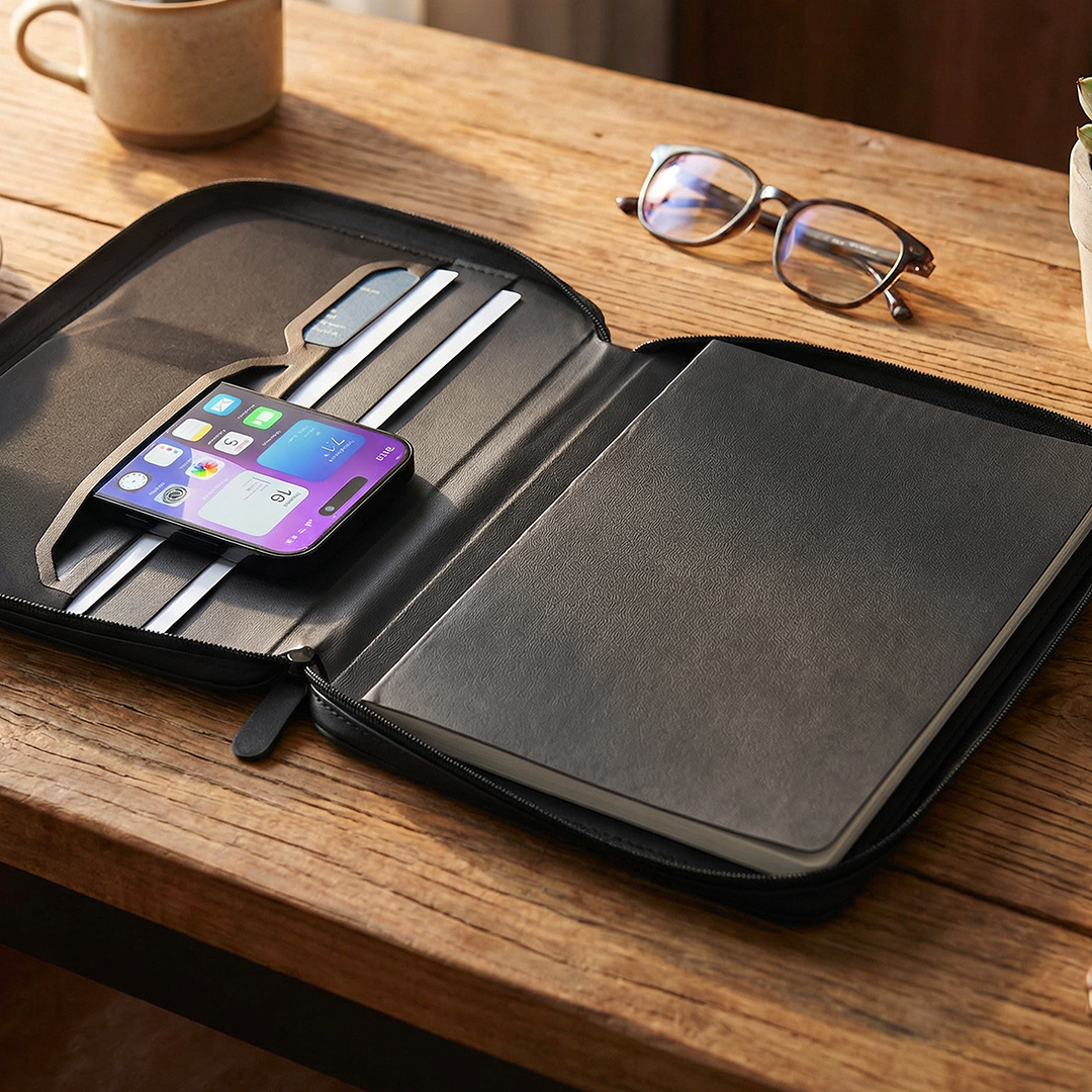 Portfolio sa notesom • Format A5 • 128 strana • Knjižni blok u linije • Krem papir 80 g/m² • Džepovi za kartice i dokumenta • Držač za olovku • Poklon kutija uključena