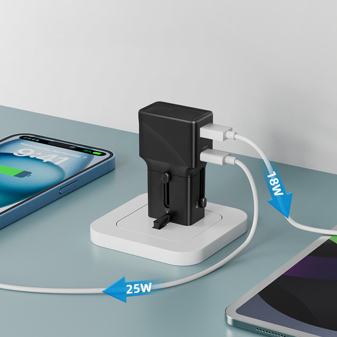 Univerzalni putni zidni punjač snage do 25W sa priključcima koji pokrivaju upotrebu širom sveta, namenjen punjenju mobilnih uređaja tokom putovanja. Opremljen je USB-C i USB-A portovima za istovremeno punjenje i koristi GaN tehnologiju za efikasno i stabilno napajanje. Isporučuje se u poklon kutiji.